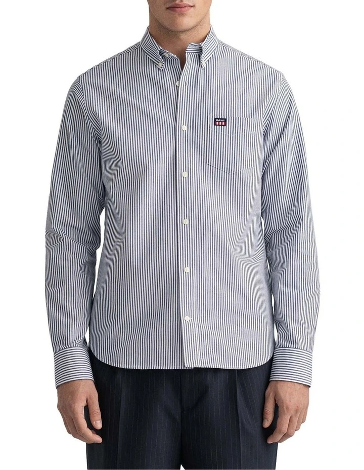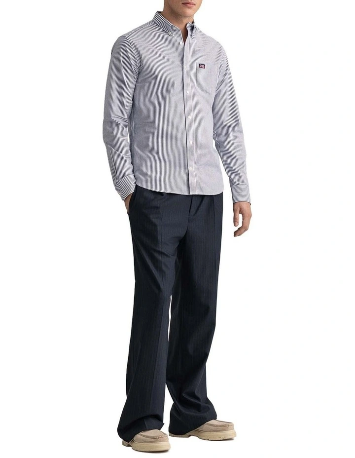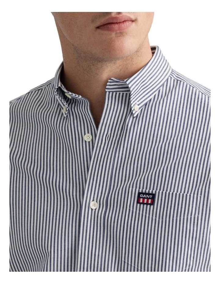 Crafted in cotton twill with a casual stripe, this regular fit shirt is designed with a shorter hem that’s made to be worn untucked. Sporting our ’90s-inspired Retro Shield logo badge at the chest pocket, this shirt has our signature boxpleat and locker loop at the back.