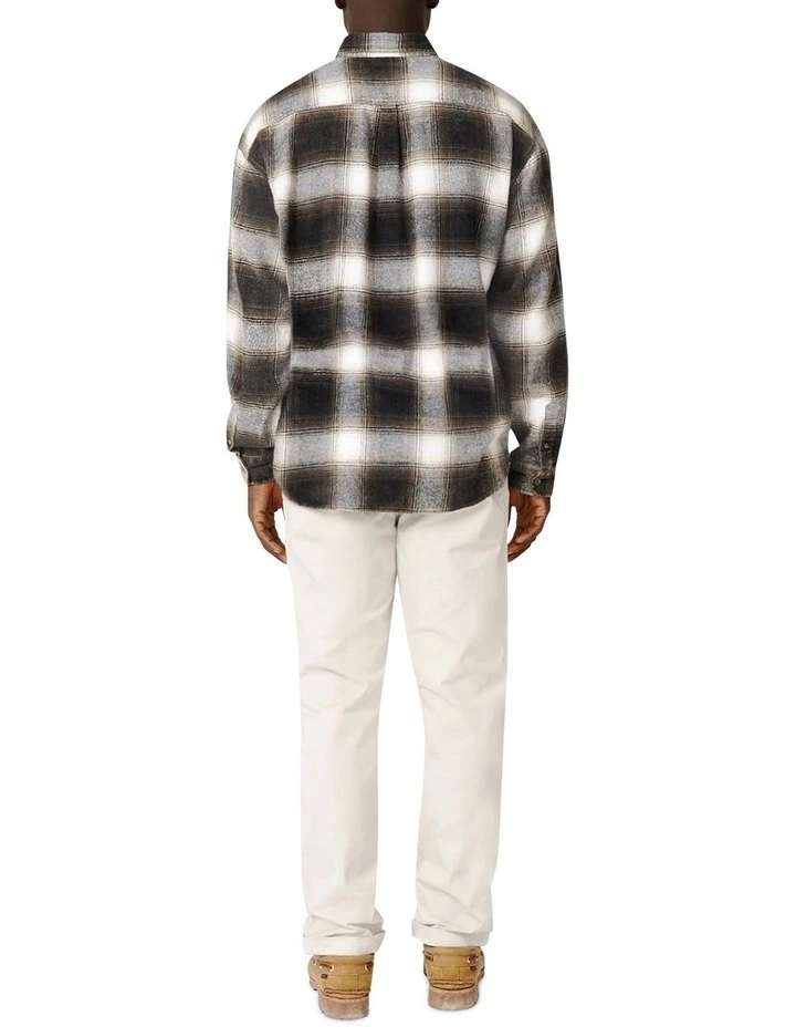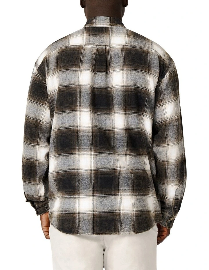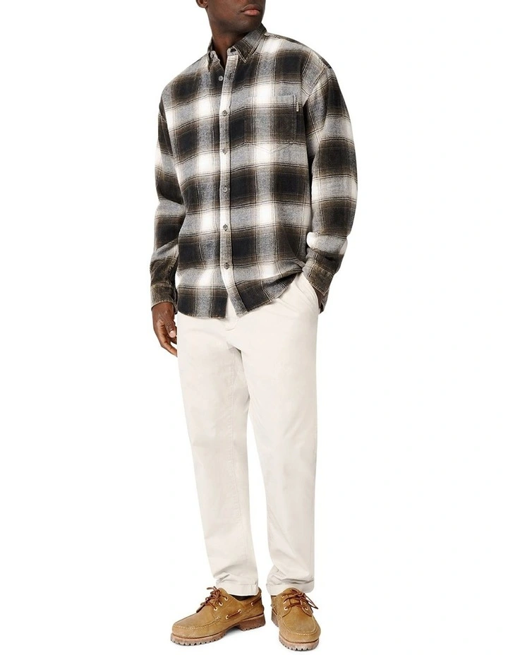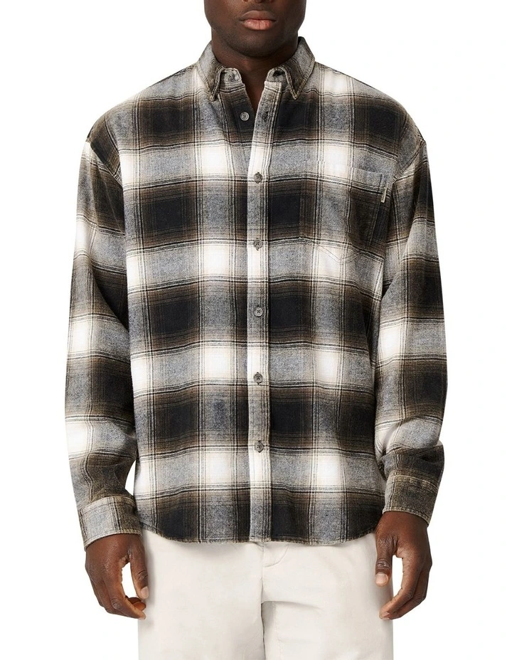 A basic long sleeve flannel shirt in a modern check design, with buttoned cuffs and a chest pocket.