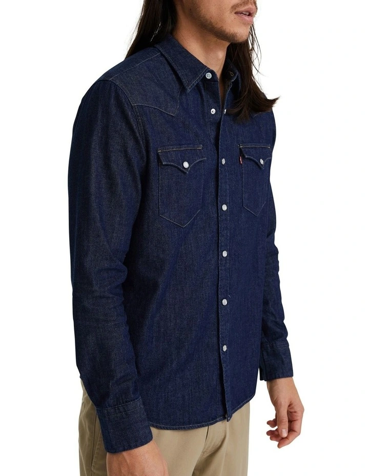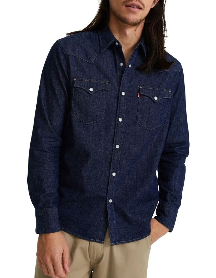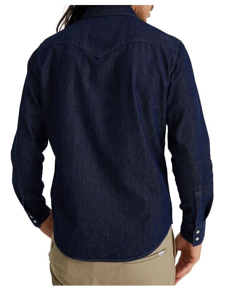 Long sleeve denim Western shirt. Original western details. Curved shirttail hem.