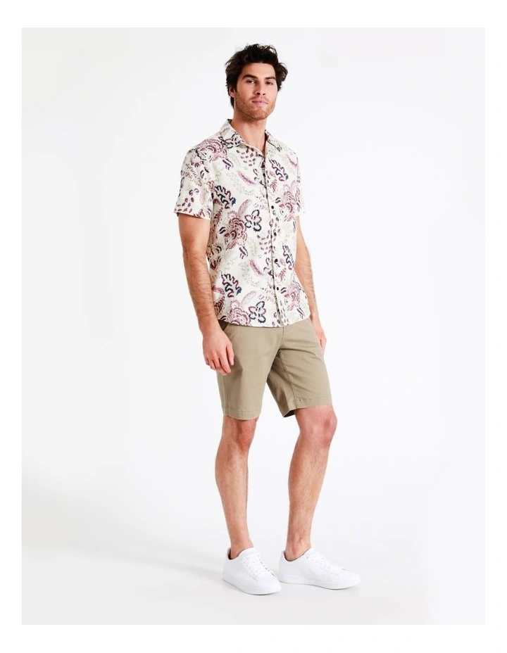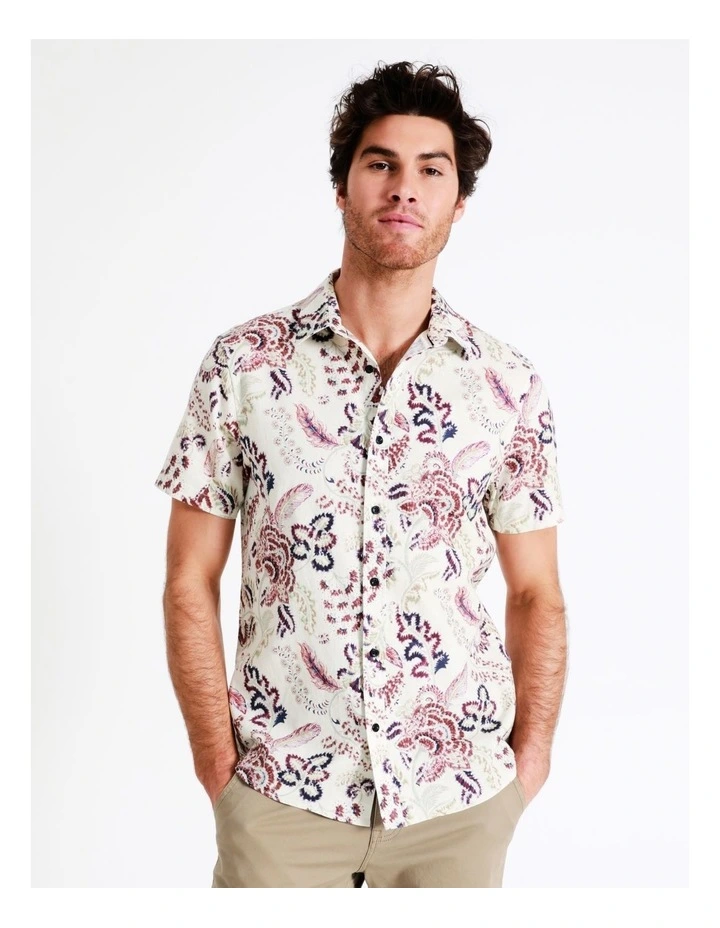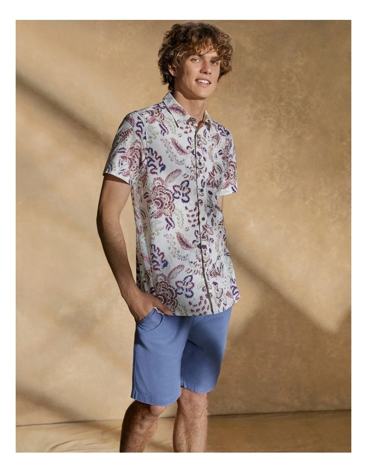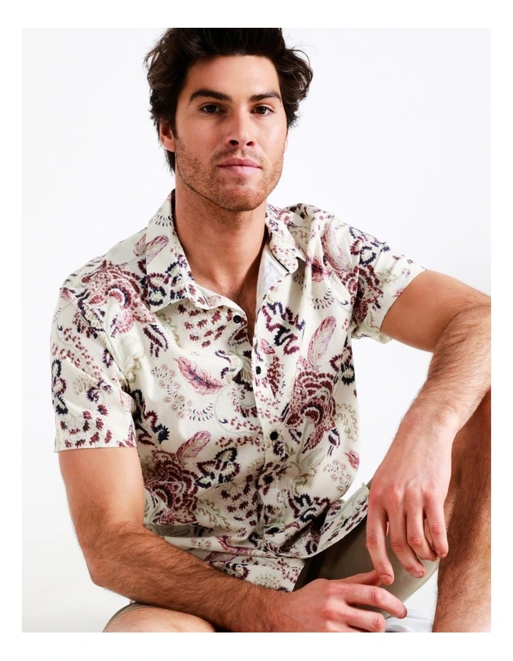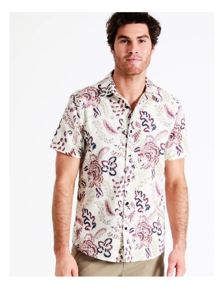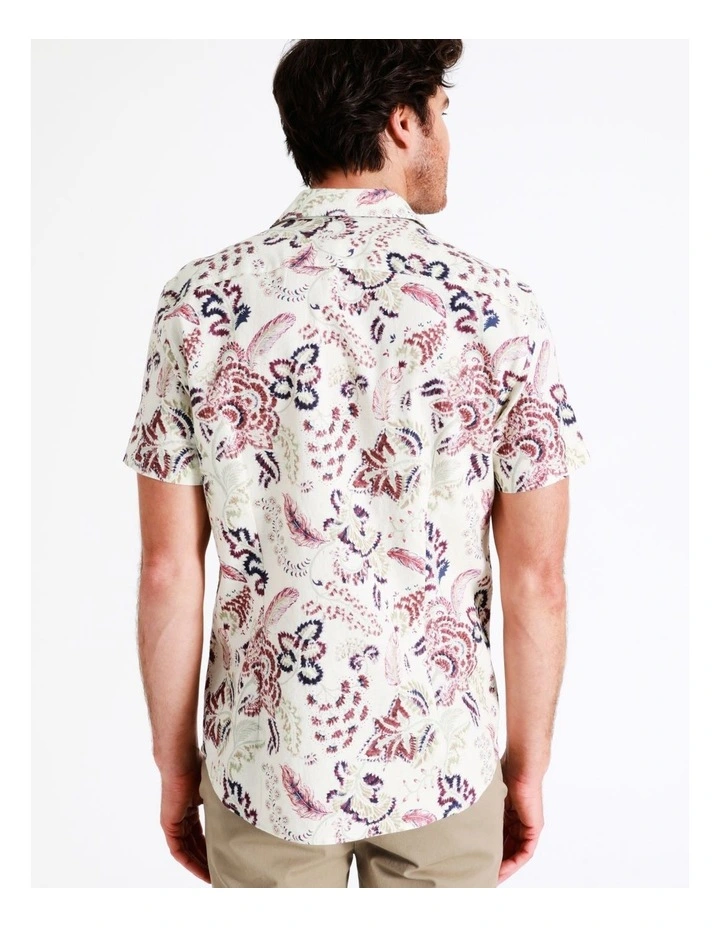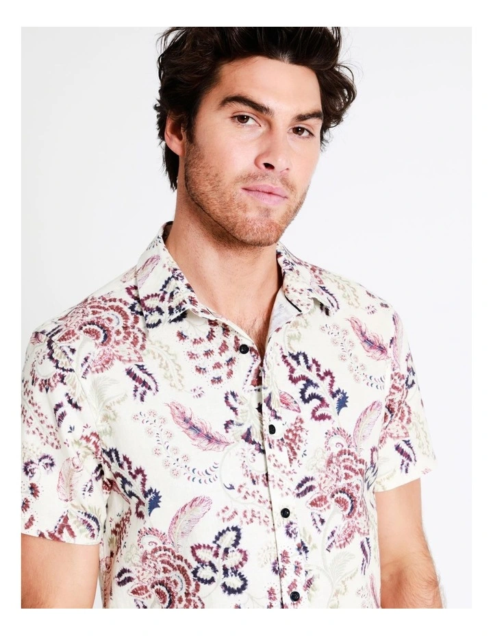 MaddoxΒ Belongil Linen Blend Print Short Sleeve Shirt in Ecru