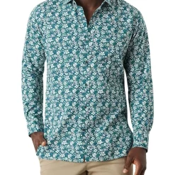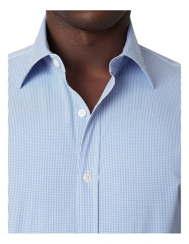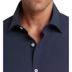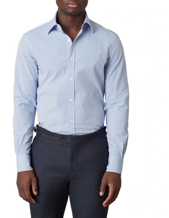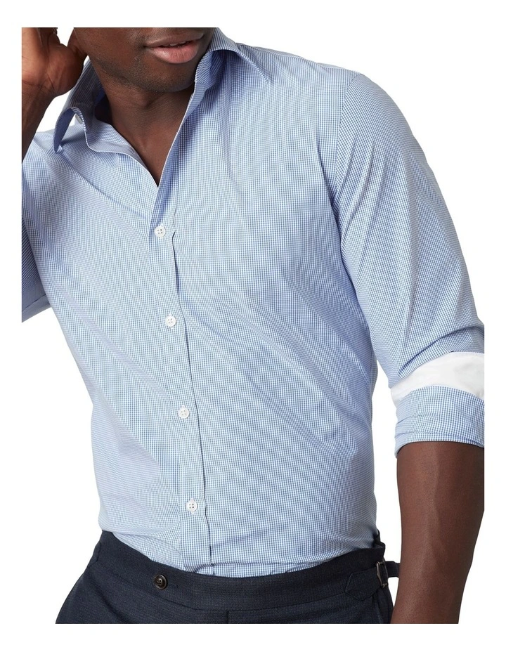 Features: Poplin construction; Great stretch recovery; Floating interlining on collar and cuff; Back darts; Twin needle side seams; 3mm stitching on collar and cuff