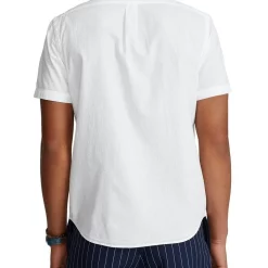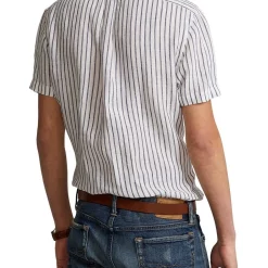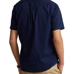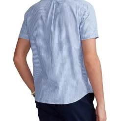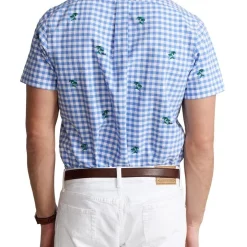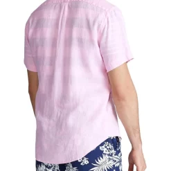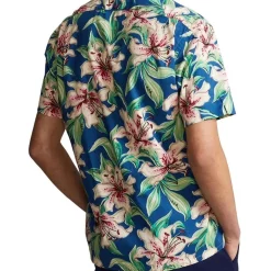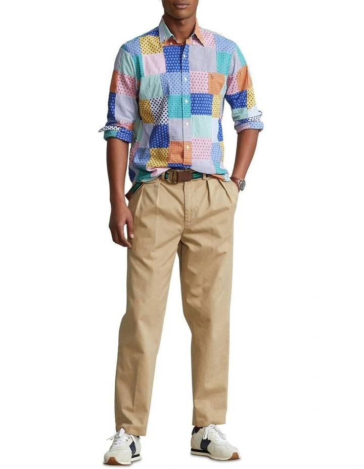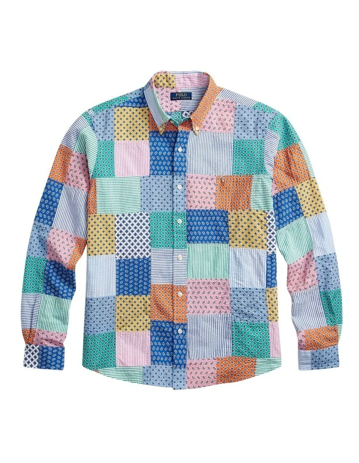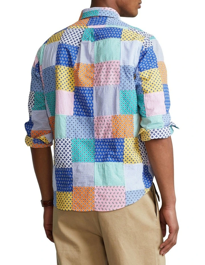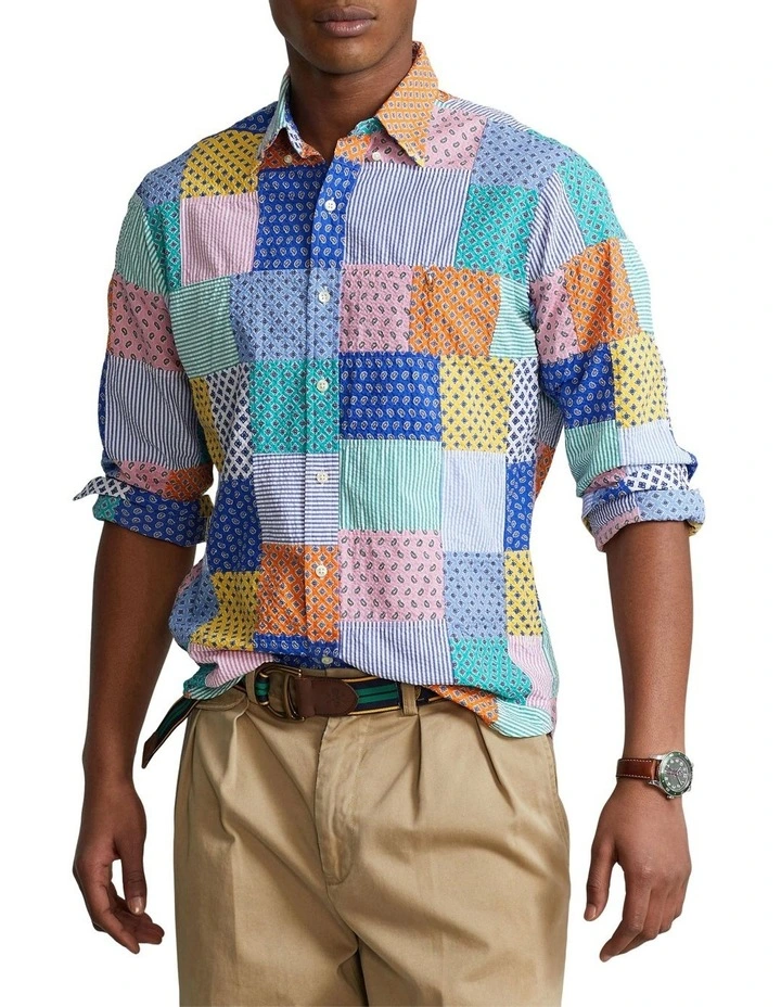 This shirt is crafted from a patchwork fabric that is composed of stripes and foulard patterns inspired by classic Ralph Lauren neckwear.