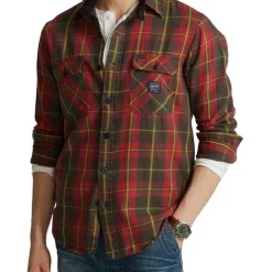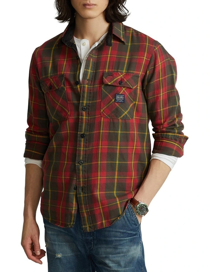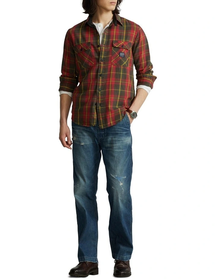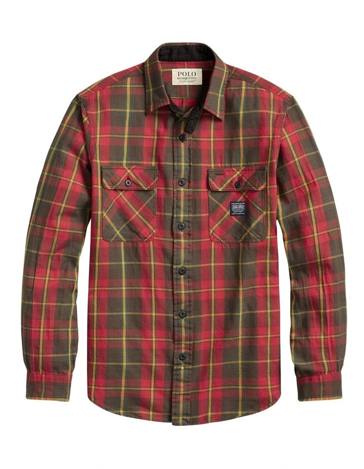 In lightweight cotton flannel, this workshirt features an archival “Denim & Supply” logo label at the chest.