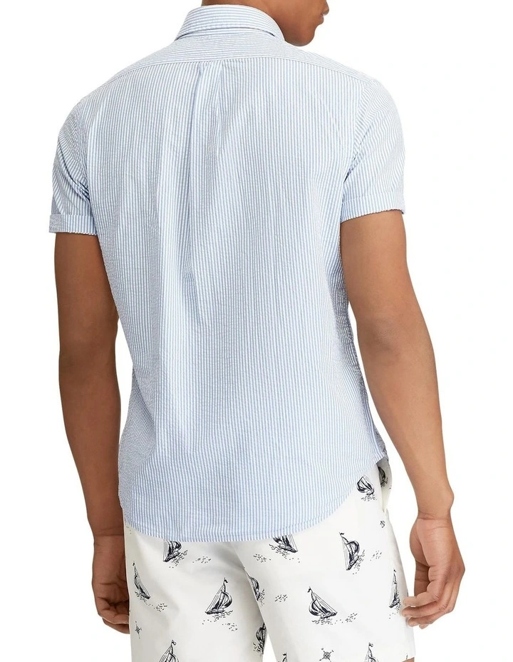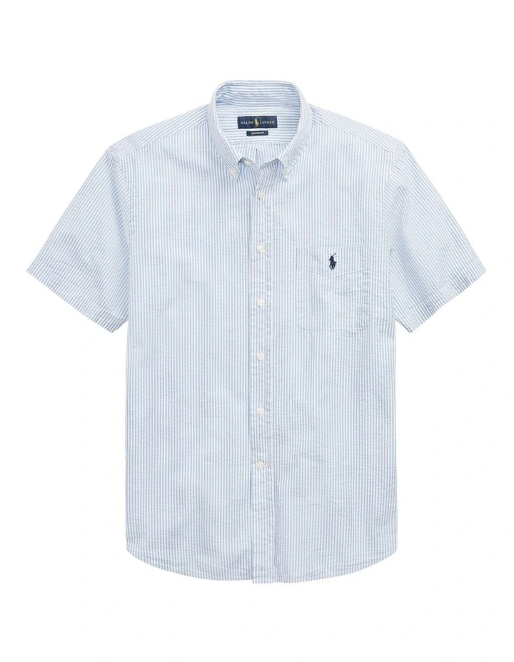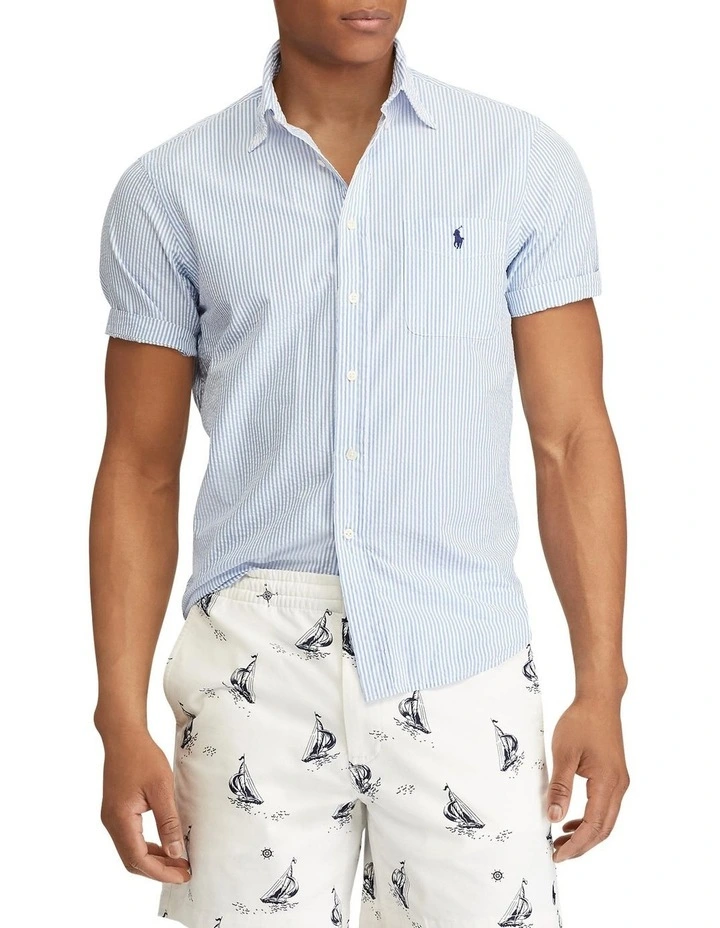 Thanks to its breathable cotton seersucker and roomy fit, this striped shirt will keep you cool and comfortable without sacrificing style.Classic Fit: a comfortable, relaxed silhouette.Size medium has a 30″ body length, an 18″ shoulder, and a 46″ chest.Button-down point collar. Buttoned placket.Short sleeves.Left chest patch pocket.Split back yoke with a box pleat ensures a comfortable fit and a greater range of motion.Signature embroidered pony at the pocket.100% cotton. Machine washable. Imported.Model is 6’1″/185 cm and wears a size medium.