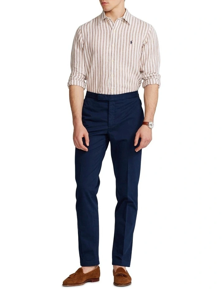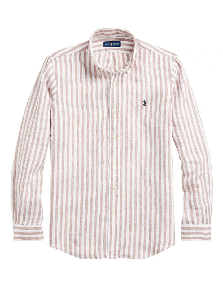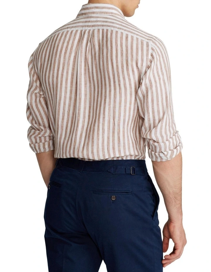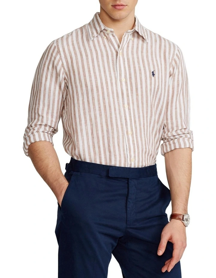 Crafted from lightweight, breathable linen, this shirt is a stylish solution for warm-weather days. Classic Fit: our roomiest silhouette. Cut for a lower armhole and a fuller sleeve. Size medium has a 31″ back body length, an 18″ shoulder, a 46″ chest, and a 34″ sleeve length. Sleeve length is taken from the center back of the neck and changes 1″ between sizes. Button-down point collar. Buttoned placket. Long sleeves with buttoned barrel cuffs. Split back yoke with a box pleat ensures a comfortable fit and a greater range of motion. Signature embroidered Pony at the left chest. Linen. Machine washable. Imported.Β Model is 6’1″/185 cm and wears a size medium.