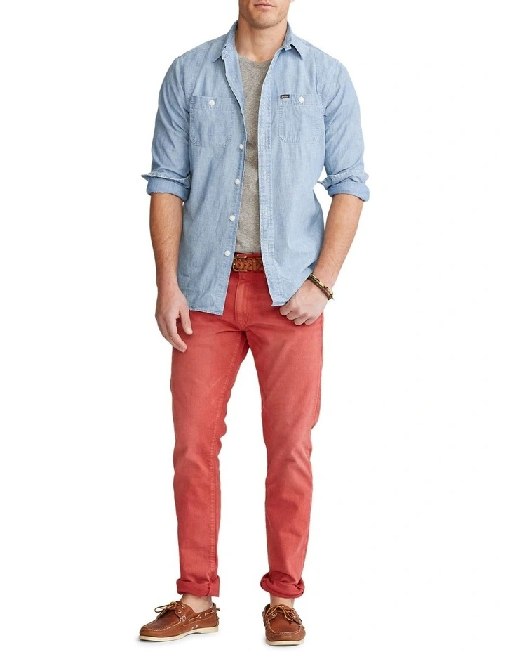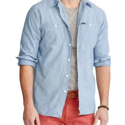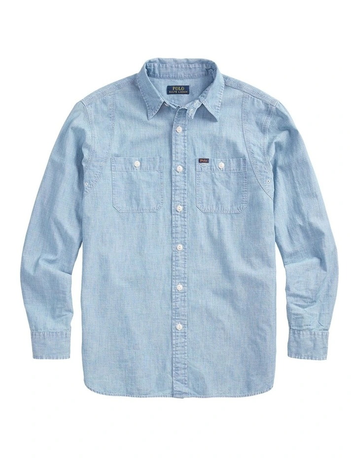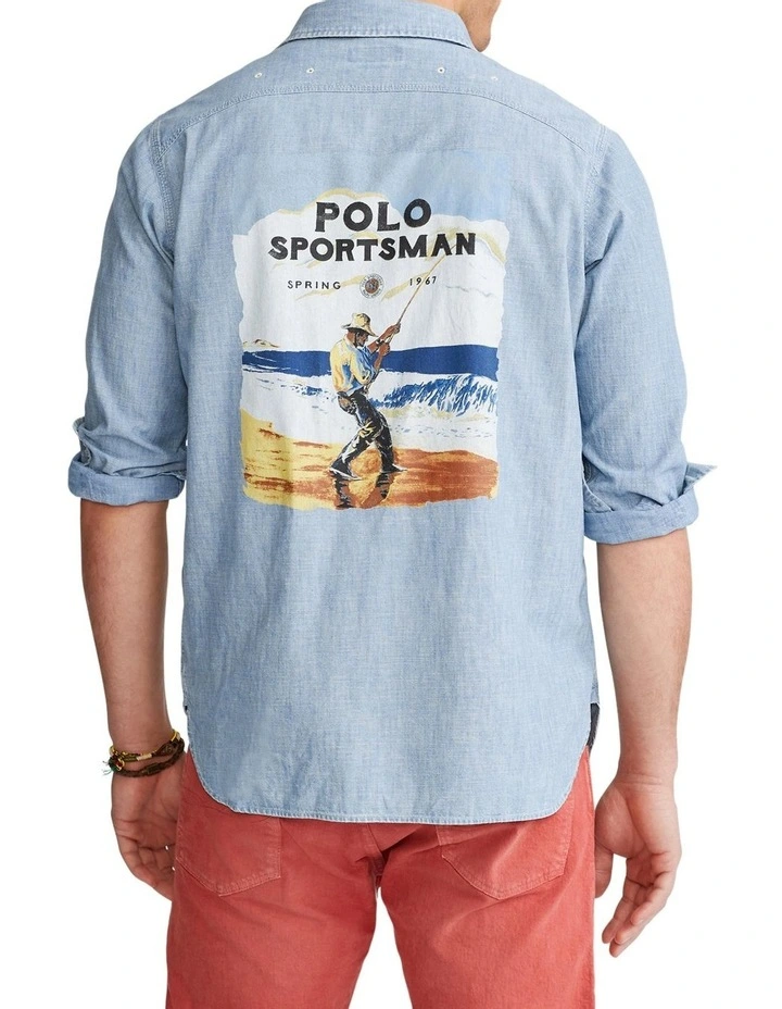 In indigo-dyed cotton chambray, this lightweight workshirt features an archival Polo Sportsman print from the early 90s.