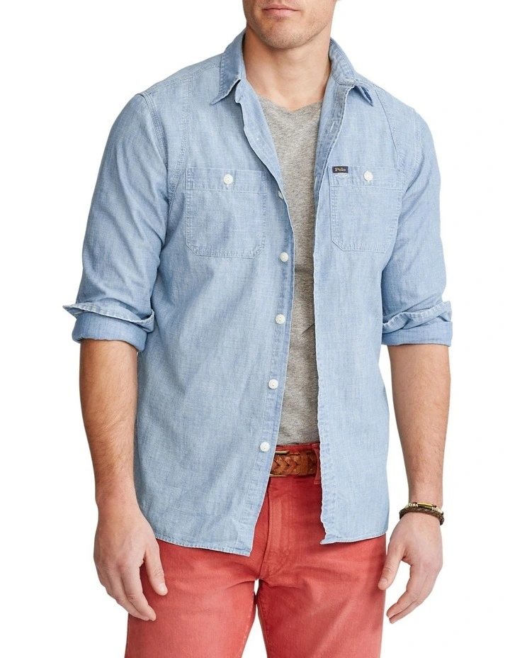 - Two chest buttoned pockets. Woven “Polo” label at the left pocket.