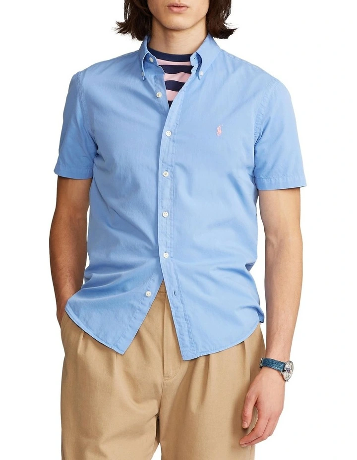 Designed with a shorter length, the RL Prepster is perfect for wearing untucked. This version is crafted from our most lightweight cotton twill and garment-dyed for a perfectly broken-in look. Features a shorter lengthperfect for wearing untucked. Classic Fit: our roomiest silhouette. Cut for a lower armhole and a fuller sleeve. Size medium has a 29″ back body length, an 18″ shoulder, and a 46″ chest. Button-down point collar. Buttoned placket. Short sleeves. Split back yoke with a box pleat ensures a comfortable fit and a greater range of motion. Locker loop at the center back. Signature embroidered Pony at the left chest. Cotton. Machine washable. Imported. Due to the natural characteristics of this material, the coloring may rub off onto fabrics and upholstery.