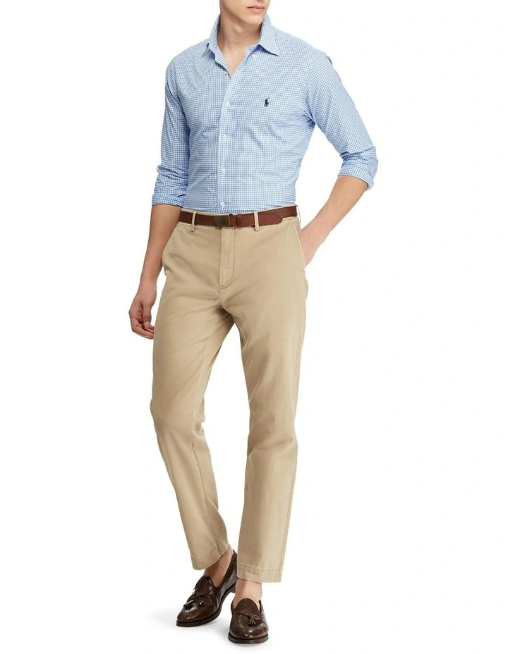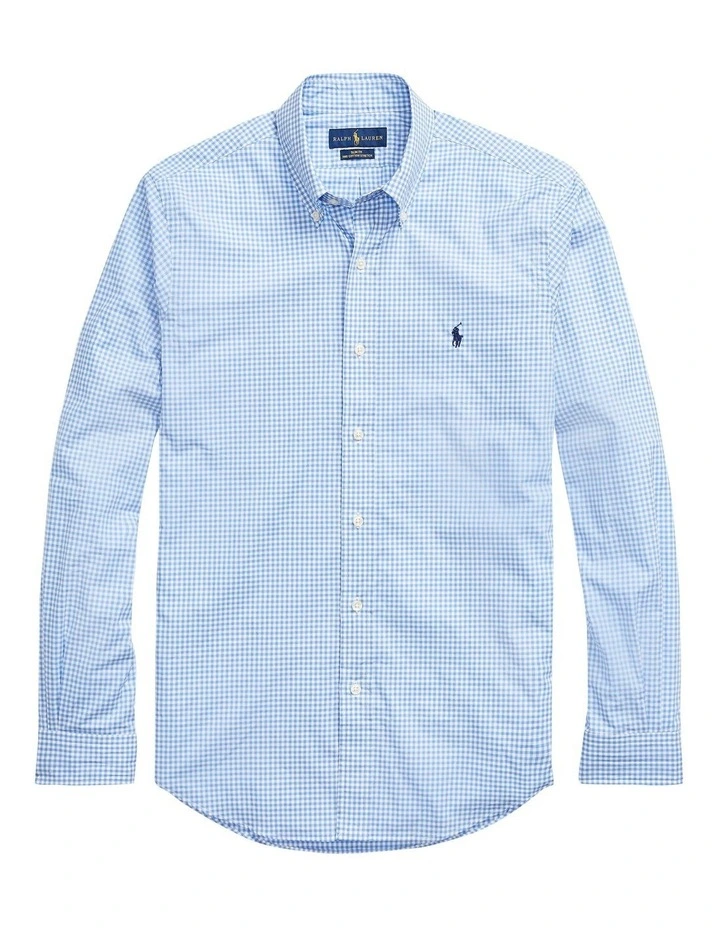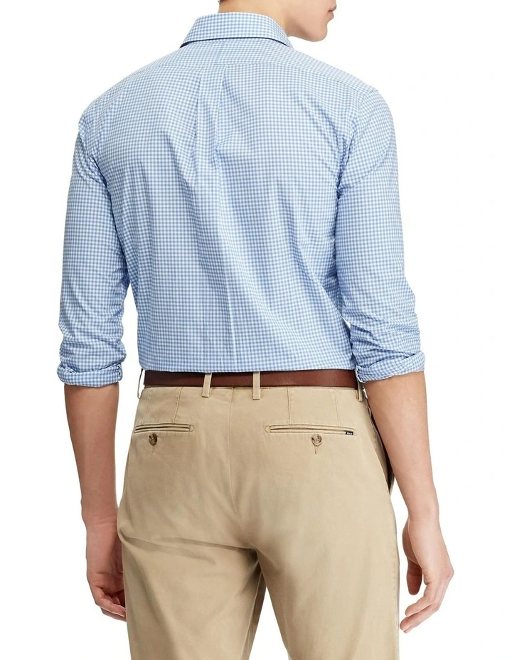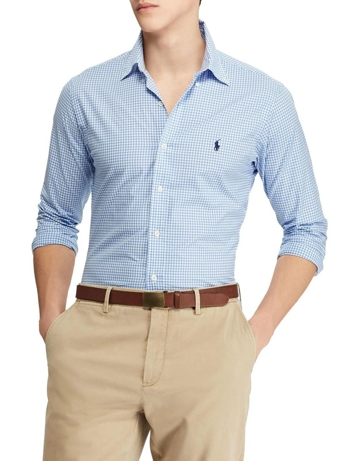 A multistep process that includes high-tension yarn-spinning gives this shirt’s pure cotton fabric a dose of stretch for ease of movement.Slim Fit: cut close to the body, with fitted sleeves and higher armholes; 5″ slimmer at the waist than our Classic Fit.Size medium has a 31″ body length, an 18″ shoulder, a 42″ chest, and a 34″ sleeve length. Sleeve length is taken from the center back of the neck and changes 1″ between sizes.Button-down point collar. Buttoned placket.Long sleeves with buttoned barrel cuffs.Split back yoke with a box pleat ensures a comfortable fit and a greater range of motion.Signature embroidered pony at the left chest.100% cotton.Machine washable. Imported.Model is 6’1″/185 cm and wears a size medium.