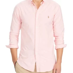 The oxford shirt made its debut at the beginning of the Ralph Lauren brand, and since then it has solidified its status as a pillar of the Polo look. Today, Mr. Lauren continues to design countless variations of his iconic shirt, including this trim version that is finished with our signature Pony.Slim Fit: cut close to the body, with fitted sleeves and higher armholes; 5″ slimmer at the waist than our Classic Fit.Size medium has a 31″ back body length, an 18″ shoulder, a 41″ chest, and a 34″ sleeve length. Sleeve length is taken from the center back of the neck and changes 1″ between sizes.Button-down point collar. Buttoned placket.Long sleeves with buttoned barrel cuffs.Split back yoke with a box pleat ensures a comfortable fit and a greater range of motion.Signature embroidered Pony at the left chest.Cotton.