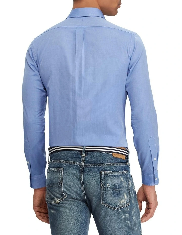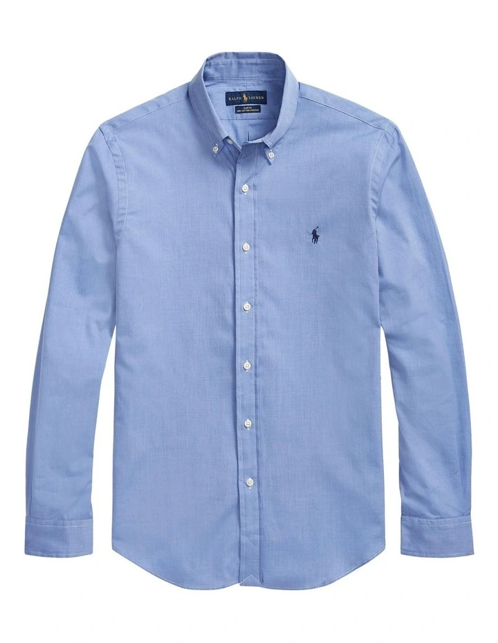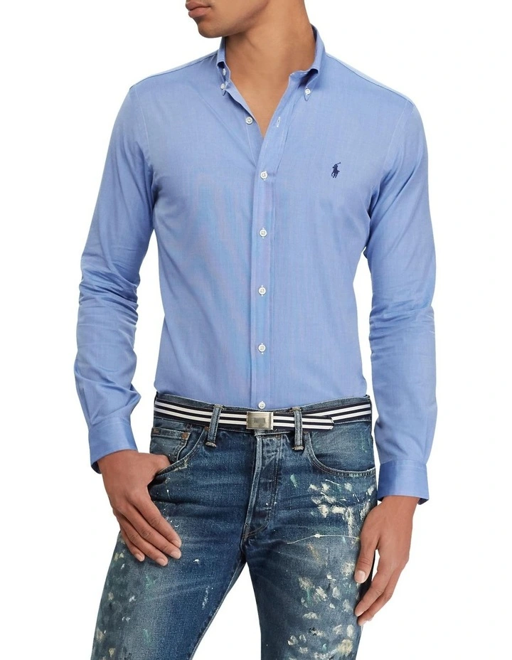 A multistep process that includes high-tension yarn-spinning gives this shirt’s pure cotton fabric a dose of stretch for ease of movement.Slim Fit: cut close to the body, with fitted sleeves and higher armholes; 5″ slimmer at the waist than our Classic Fit.Size medium has a 31″ body length, an 18″ shoulder, a 42″ chest, and a 34″ sleeve length. Sleeve length is taken from the center back of the neck and changes 1″ between sizes.Button-down point collar. Buttoned placket.Long sleeves with buttoned barrel cuffs.Split back yoke with a box pleat ensures a comfortable fit and a greater range of motion.Signature embroidered pony at the left chest.100% cotton.
